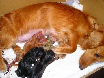 暑い時期のお産で心配しましたが幸いにも昨日今日と過ごしやすく、なるとに運が見方したかな(笑)なんて思っています。母子とも今のところ順調です。男の子2頭はブラックタンもしくはブラッククリーム、女の子は1頭がなるとカラーのゴールドかな、もう1頭は真っ白なピュアクリームです。